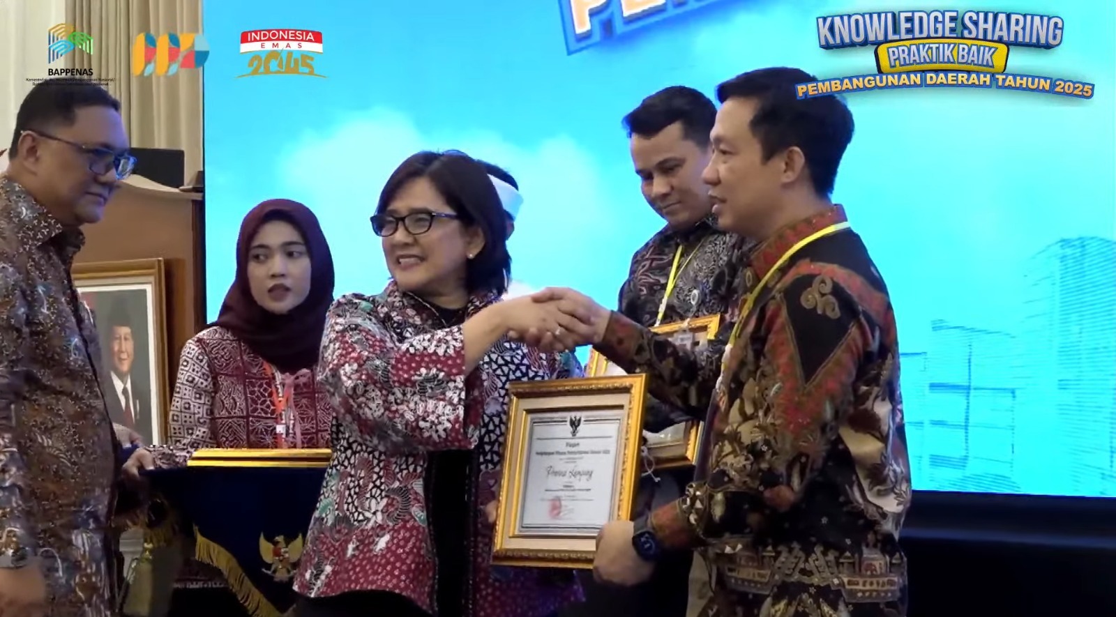Penghargaan Pembangunan Daerah Tahun 2025 diterima oleh Gubernur Lampung Rahmat Mirzani Djausal yang diwakili oleh Sekretaris Daerah Provinsi Lampung, Marindo Kurniawan, pada kegiatan Knowledge Sharing Praktik Baik Pembangunan yang diselenggarakan di Kantor Kementerian PPN/Bappenas Republik Indonesia, Jakarta, Senin (15/12/2025).