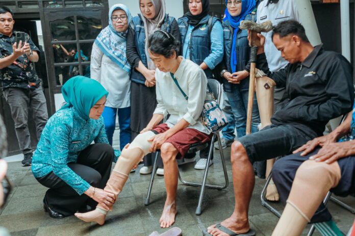 Penyerahan bantuan dilakukan secara simbolis dan dilanjutkan dengan pemasangan kaki palsu kepada para penerima manfaat. Kegiatan ini merupakan hasil kolaborasi antara TP PKK Provinsi Lampung dan Dinas Sosial Provinsi Lampung sebagai bentuk kepedulian pemerintah daerah terhadap penyandang disabilitas.