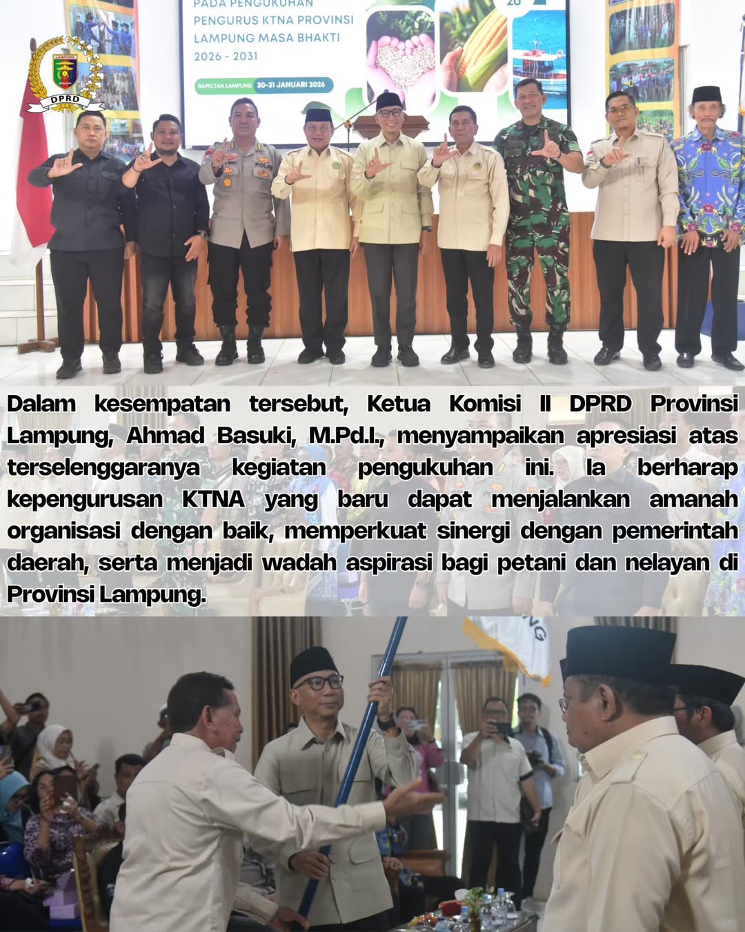 Bandar Lampung ,- Ketua Komisi II DPRD Provinsi Lampung, Ahmad Basuki, M.Pd.I., mewakili Ketua DPRD Provinsi Lampung, menghadiri kegiatan Pengukuhan Pengurus Kelompok Kontak Tani Nelayan Andalan (KTNA) Provinsi Lampung Masa Bhakti 2026–2031, Sabtu (31/1/2026).