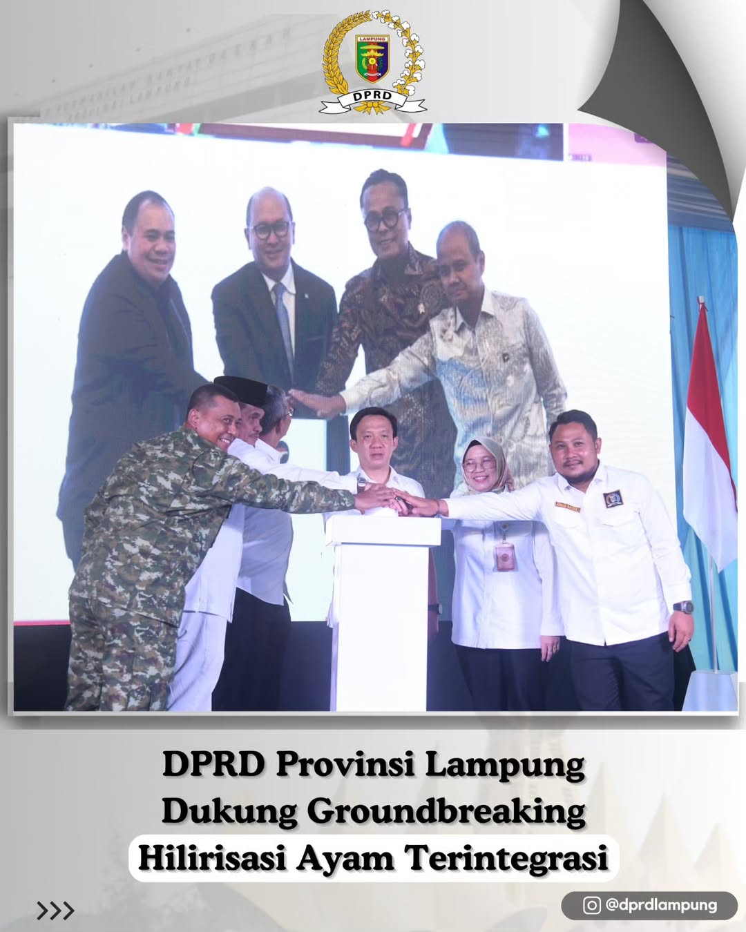 Bandar Lampung,-Dewan Perwakilan Rakyat Daerah (DPRD) Provinsi Lampung menyatakan dukungan penuh terhadap pelaksanaan Groundbreaking Program Pengembangan Hilirisasi Ayam Terintegrasi sebagai bagian dari upaya memperkuat ketahanan pangan daerah serta mendorong peningkatan nilai tambah sektor peternakan di Provinsi Lampung yang digelar di Kebun Trikora PTPN I Regional 7, Kabupaten Lampung Selatan, Jumat, 6/2/2026.