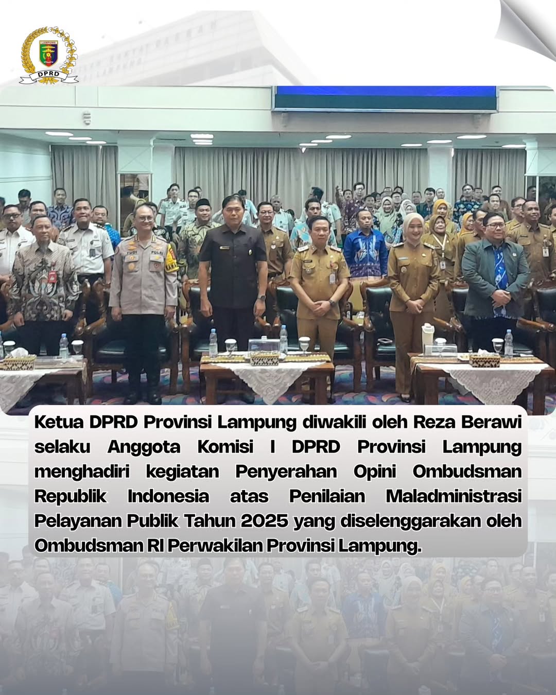 Bandar Lampung,-Dewan Perwakilan Rakyat Daerah (DPRD) Provinsi Lampung menghadiri kegiatan Penyerahan Opini Ombudsman Republik Indonesia atas Penilaian Maladministrasi Pelayanan Publik Tahun 2025 yang diselenggarakan oleh Ombudsman Republik Indonesia Perwakilan Provinsi Lampung, bertempat di Balai Keratun Lantai III, Kantor Gubernur Provinsi Lampung, Senin (9/2/2025).