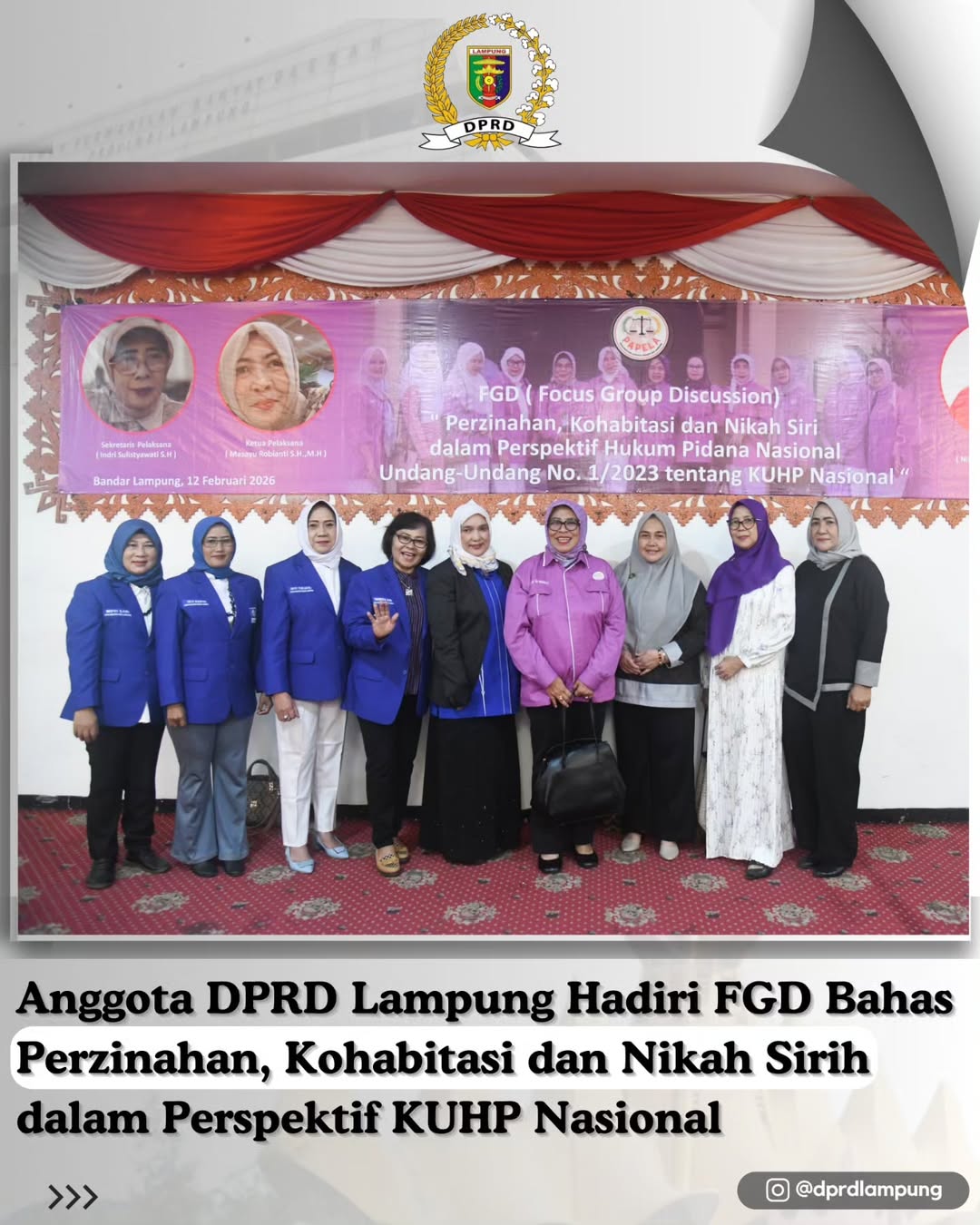 Bandar Lampung ,-Anggota DPRD Provinsi Lampung dari Fraksi Partai Amanat Nasional (PAN), Diah Dharma Yanti, SH., MH., menghadiri kegiatan Focus Group Discussion (FGD) yang diselenggarakan oleh Perkumpulan Advokat Perempuan Lampung di Balai Keratun, Kamis (12/2/2026).